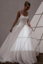 Our enchanting Aire features a peaked pleated tulle bodice that beautifully hugs the silhouette, creating an elegant and structured look. Her sophisticated drop waist adds a touch of modern flair, elongating the figure and gracefully transitioning to a soft, flowing A-line skirt.
