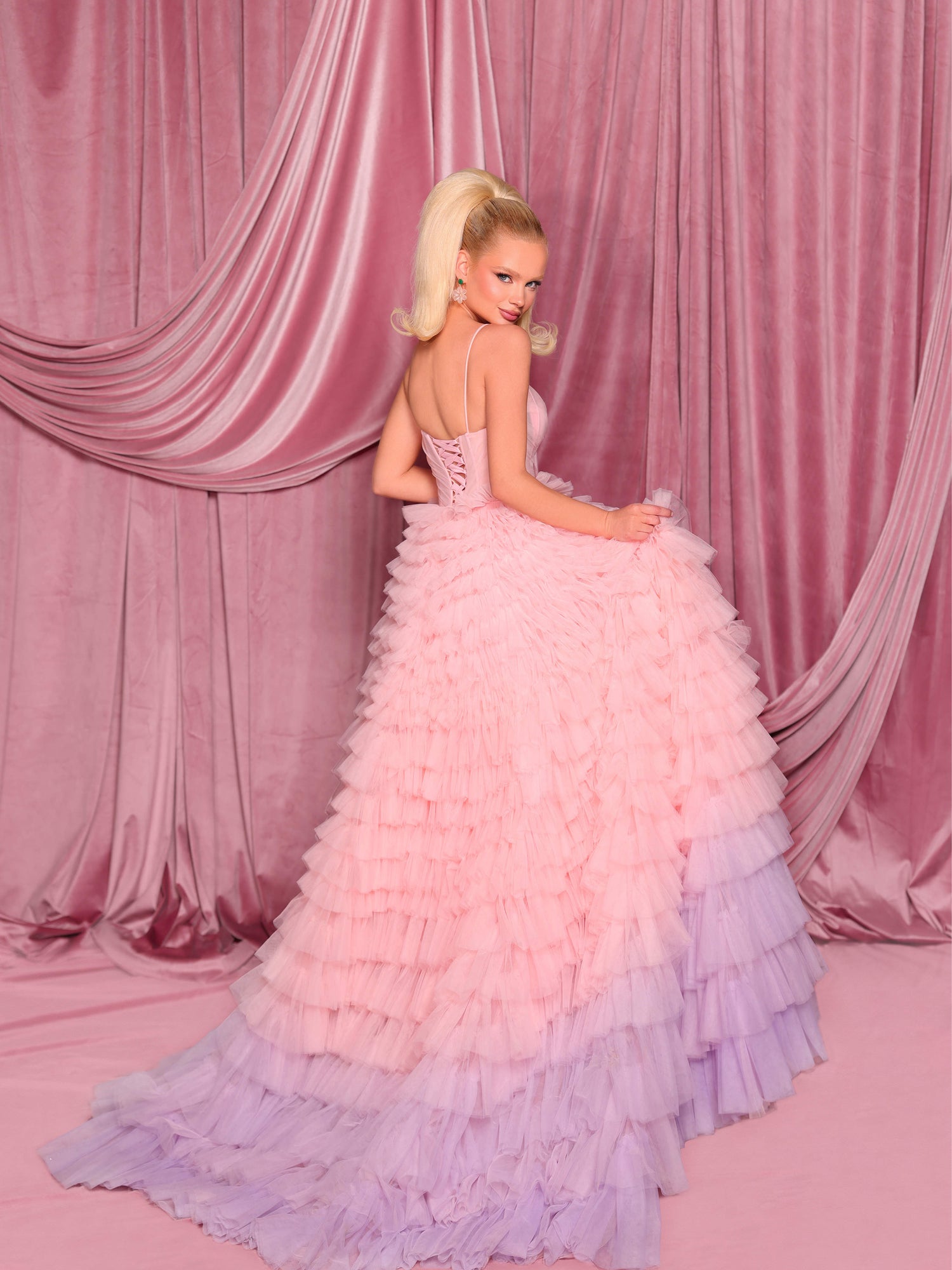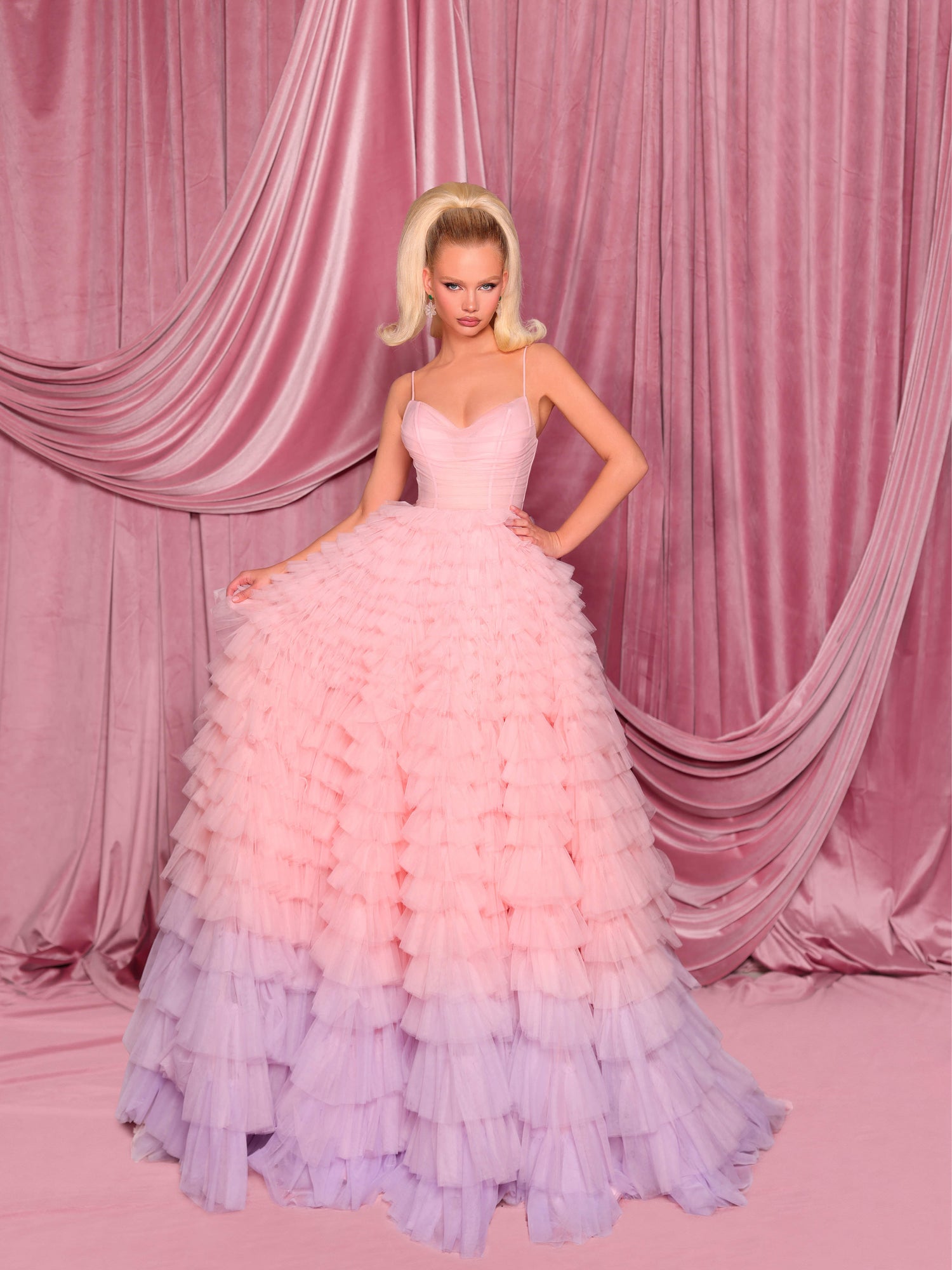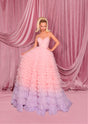 This breathtaking gown combines classic elegance with contemporary flair. It features a sweetheart neckline and a cinched waist that beautifully flatters the figure, flowing into a full, dramatic skirt. Its cascading ombré pleated layers create soft, graceful movement with every step. Designed with a structured fit and no stretch, the gown is fully lined for comfort and includes built-in padding for support. A lace-up back completes this show-stopping piece, perfect for unforgettable occasions.