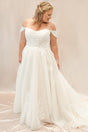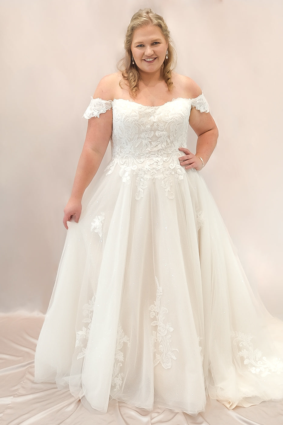 Celebrate your curves with confidence in this breathtaking gown. Designed to enhance and embrace your figure, this gown features a beautifully crafted lace bodice that gracefully drapes off the shoulders, highlighting your neckline and collarbones with a touch of romantic elegance. The curve-friendly silhouette ensures a perfect fit, offering both comfort and sophistication. With its timeless lace detailing and flattering design, this dress is ideal for the curvy bride who wishes to radiate beauty and grace on her special day.