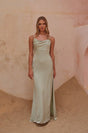 Crafted from luxurious matt satin, this dress offers both comfort and a sense of understated elegance. The bodice features a cowl front scooped neckline, creating a soft and flattering look, complemented by flat straps and a high-cut waistline.