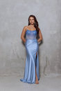 This elegant formal dress is perfect for special occasions like leavers events. The gown features a flattering strapless neckline with intricate beaded details on the bodice, creating a sparkling effect. The sleek satin fabric falls gracefully into a floor-length skirt with a high slit, adding a touch of sophistication.