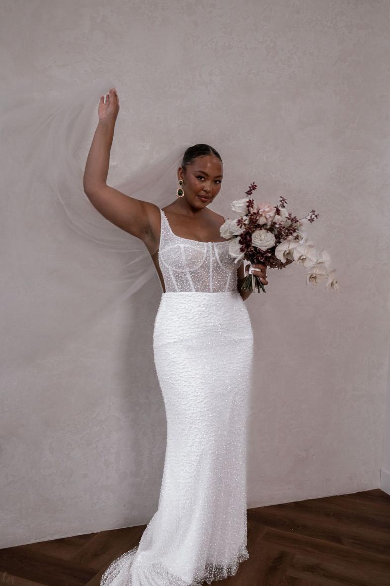 Freddie is set to make a mark on the bridal world with her intricate pearlescent beading, delicate Chantilly underlay and jaw-dropping corset-style bodice.