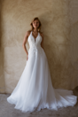 The Theia wedding dress features a modern A-line silhouette. This bridal gown boasts a halter neckline and plunging V-neck adorned with delicate crystal beading. Enhanced with a nude tulle modesty panel, the neckline maintains allure. The meticulously crafted bodice, complete with inner bust cups and boning, ensures a flawless fit and unmatched comfort. The lace applique of the bodice softly cascades into a voluminous plain tulle skirt with a court-length train. This gown promises a dramatic yet elegant entrance.