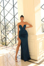 Elegant and alluring, this strapless gown by Nicoletta (NC1073) features a curved bust line with a plunging V-neckline for a bold, feminine touch. Designed to flatter, the silhouette hugs the body with subtle centre ruching and a sleek side leg split—perfect for making a graceful statement at any formal event.
