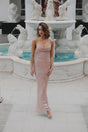 The Sydney TO860 bridesmaid dress by Tania Olsen Designs is made for the most extra of bridesmaid groups. The Sydney features a delicate cowl neckline and ultra thin spaghetti straps that sit on the shoulders that fall to a mid square back. This dress has a long, floor length skirt and a zipper free design making it effortless to put on and take off. The stretch sequin fabric looks amazing in photographs and best of all can be re-worn to another fancy occasion! The Sydney is available in Rose, Silver and Navy in sizes AU 4-30.