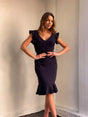 V Neck cocktail dress with flutter sleeve and frill hem - Navy