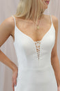 The dress showcases delicate spaghetti straps that gracefully highlight your shoulders, leading to a refined V-neckline. For added versatility, the modesty panel can be adorned with optional lace appliqué as pictured, allowing you to tailor the look to your personal style and add a touch of romantic charm.
