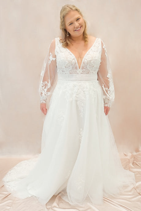 Sample sizes vary by designers but we carry a range from bridal sizes 6-32 with the majority being 10-26. If your sizing is outside that range, not to worry, we have creative ways of making sure you can experience the look of your desired dress! Our gowns are made to order so depending on the designer we can order from a size 0-40+!