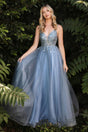 This stunning A-line gown is layered in glittered luxe tulle and sparkling lace appliques. The illusion lace bodice has a deep neckline and thin double straps for an open back detail.