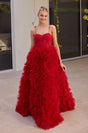 The full A-line skirt exudes charm and allure, with gathered tulle ruffles that add a touch of drama and movement to your look.