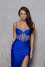 Introducing the Aurelie Dress by Poseur PS2404 - a stunning gown fit for any special occasion! The sheer boned bodice, adorned with crystal appliqué, adds a touch of glamour while the gathered waistline and leg slit provide a figure-flattering silhouette. Made from shimmering satin glitter fabric, this dress is sure to catch the eye and make you feel like the belle of the ball.