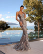 Step into refined elegance with the NC2017 by esteemed Australian designer Nicoletta. This glamorous strapless design features a deep sweetheart neckline, a structured padded bust, and a sleek, figure-hugging silhouette that flares into a dramatic mermaid skirt. Adorned with an opulent sequin pattern, the gown is beautifully enhanced by detachable sheer sleeves, adding versatility and a touch of ethereal charm.