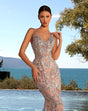 Unveil the captivating allure of the NC2070 by Nicoletta. Designed with a plunging V-neckline and a sheer corset-style bodice, this gown creates a striking, sculpted silhouette. The shimmering sequin-adorned skirt flows into a graceful mermaid shape with a trailing back for added drama and elegance.