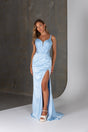 Sophisticated and striking, our Tiger formal dress by Tania Olsen Designs is crafted from smooth satin and adorned with intricate lace appliqué for a look that blends timeless romance with modern edge. The structured corset bodice features a lined front for coverage and an illusion back for a touch of allure, beautifully complemented by lace-detailed straps. A mesh insert between the bust adds subtle definition, while the lace-up back paired with an invisible zipper ensures a secure, customizable fit. The sleek satin skirt is fully lined and features a high leg split, allowing for graceful movement with a hint of drama. Perfect for formal events, proms, or evening occasions that call for head-turning elegance.