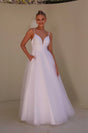 Crafted from delicate tulle, this dress showcases a graceful and understated beauty. The bodice features a mesh-inserted V-front neckline, adding a touch of modern flair, while a high waistband gracefully follows through to a low back, creating a captivating silhouette.