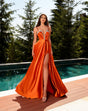 The stunning NC2084 gown by Nicoletta features delicate spaghetti straps and a corset-style bodice embellished with dazzling diamante accents and sheer mesh detailing. A deep plunging V-neckline, cinched waist, and flowing A-line silhouette with a thigh-high side slit create a look of effortless elegance—perfect for any formal occasion.