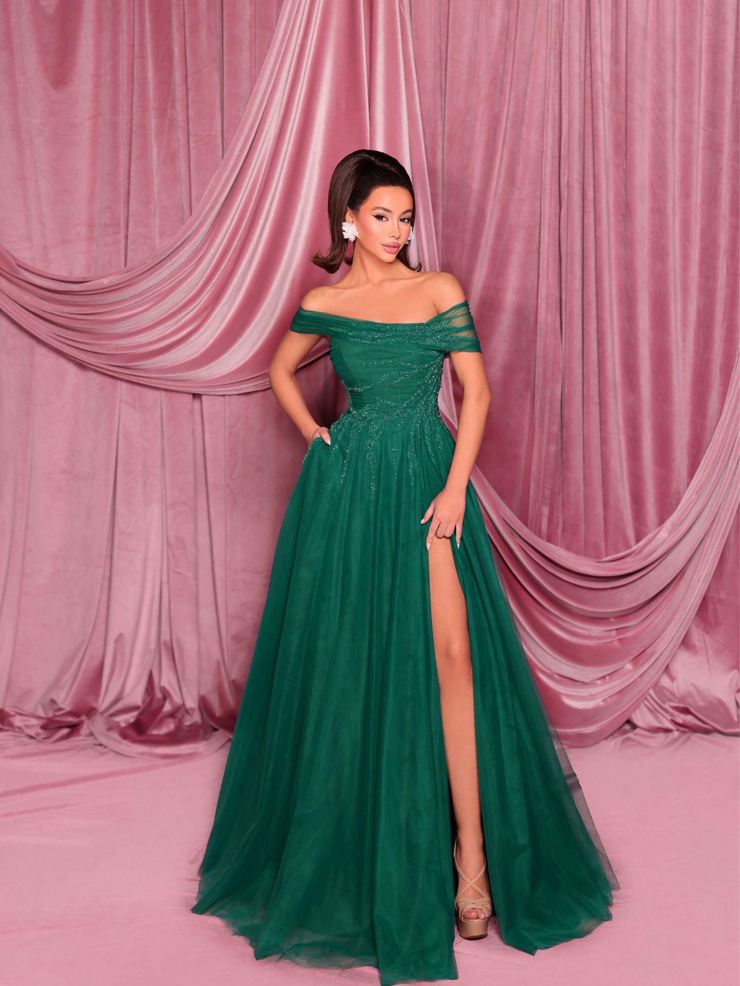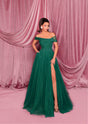 This stunning gown showcases a straight neckline with gracefully draped sleeves, a structured bodice with built-in cups and boning for support, and is crafted from luxurious tulle embellished with sequins. The flowing A-line skirt, featuring a thigh-high slit, adds an elegant touch of movement and sophistication.