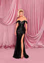 Step into sophistication with this exquisite stretch jersey gown, designed to contour your figure flawlessly. Sparkling diamanté accents add a touch of luxe, while the off-shoulder sweetheart neckline enhances its timeless elegance. The structured bodice flows seamlessly into a ruched skirt with a daring thigh-high split, guaranteeing a show-stopping entrance at your next special occasion.