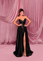 Make a show-stopping entrance in this stunning satin ballgown, featuring an intricately pleated bodice that forms a flattering V-shaped drop-waist design. The voluminous skirt flows beautifully for effortless movement, while a front leg slit adds elegance and elongates the silhouette.