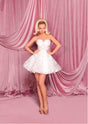 Step into a princess-worthy look with this elegant mini dress. Featuring a sweetheart neckline and a bustier corset-style bodice with subtle sheer panels and exposed boning, it combines structure with sophistication. The slightly stiff organza skirt flares beautifully, accented with delicate 3D appliqué for added dimension. Available in multiple colours, this versatile gown is perfect for any formal short-dress occasion.