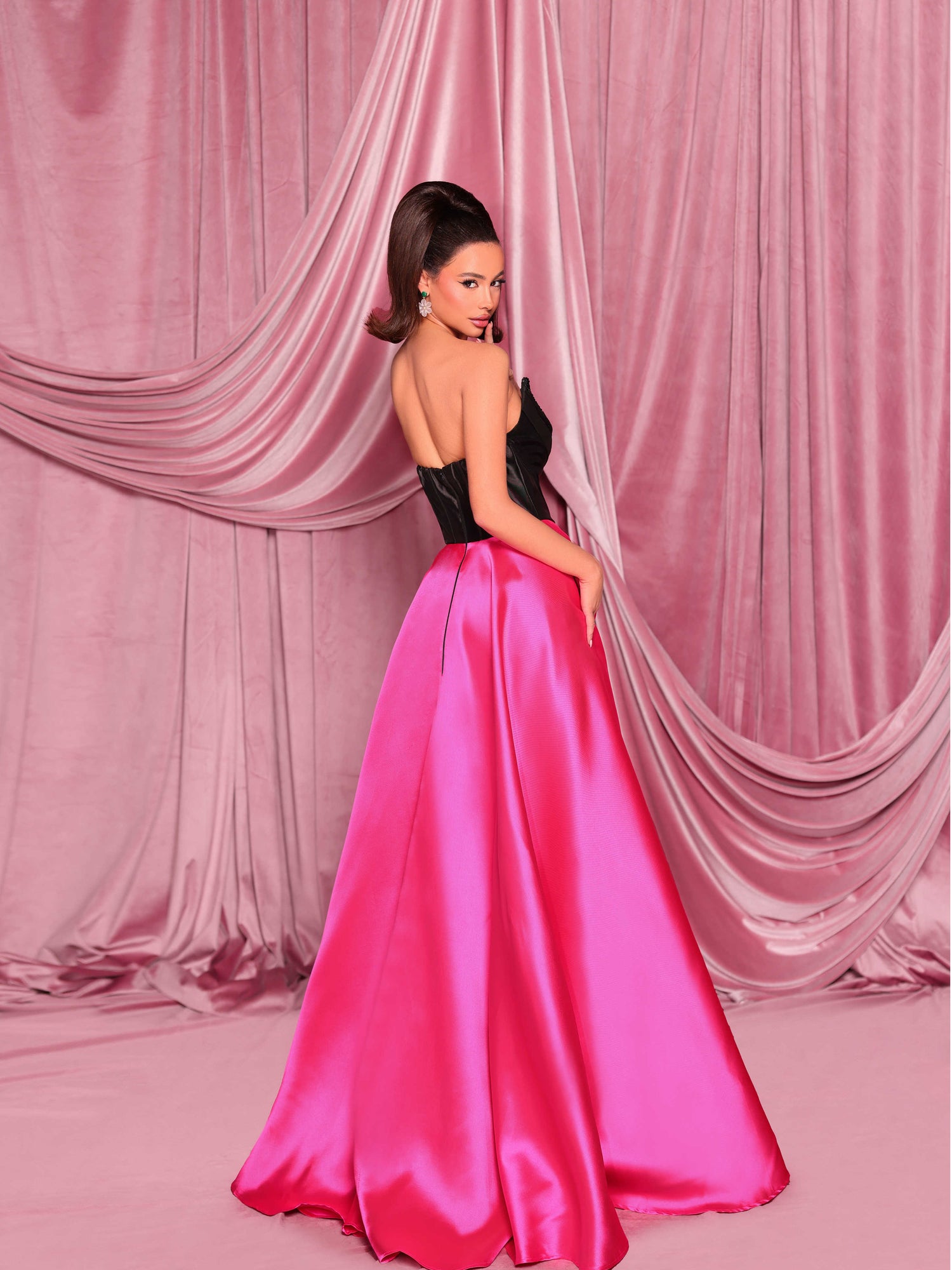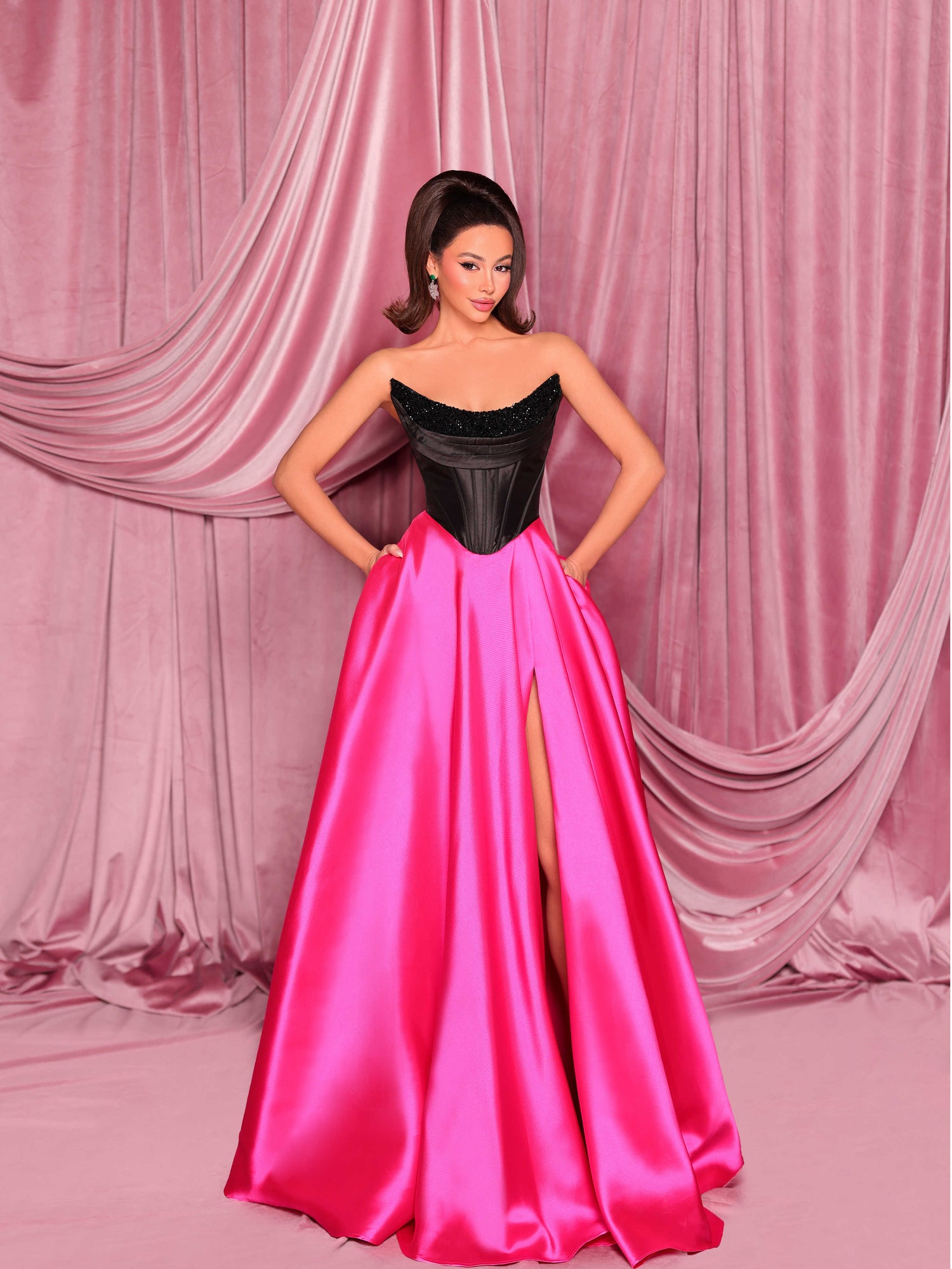 Step into elegance with the ultimate formal gown designed for the lady who dreams of feeling like royalty. This strapless masterpiece showcases a corset-inspired neckline with a soft cowl detail, delicately adorned with shimmering beadwork for a touch of glamour. The structured bodice, complete with in-built cups and boning, ensures flawless shape and support. Made from luxurious Mikado fabric, the sweeping A-line skirt glides effortlessly with every step, while a daring thigh-high split adds just the right hint of drama. And yes—it even has pockets!