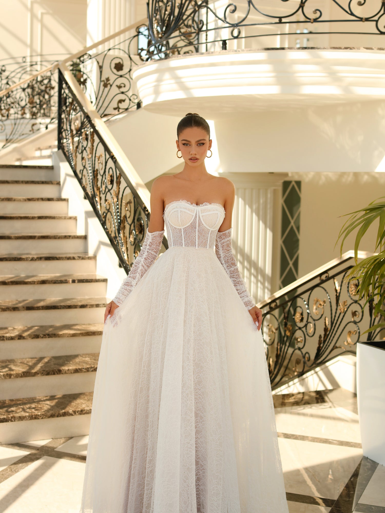 The NC1005 by Nicoletta offers a dreamy, timeless look perfect for any glamorous occasion. Featuring a strapless corset bodice delicately adorned with Chantilly-inspired lace, this gown exudes elegance. The A-line silhouette, paired with sheer lace gloves, gives the design an ethereal and graceful feel. Step into the spotlight and embrace your inner beauty with this romantic and classic gown.