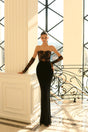 Turn heads in the striking NC1034 by Nicoletta. This elegant gown features a strapless, form-fitting corset bodice adorned with a contemporary leaf sequin pattern, offering both style and structure for a confident, flattering silhouette. Paired with sheer ruched over-elbow gloves, this look is made for standout moments at any formal occasion.