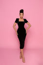 A gorgeous midi dress by Nicoletta NP160. A flattering style with a square neckline, short sleeves and accentuating shoulder pads.
