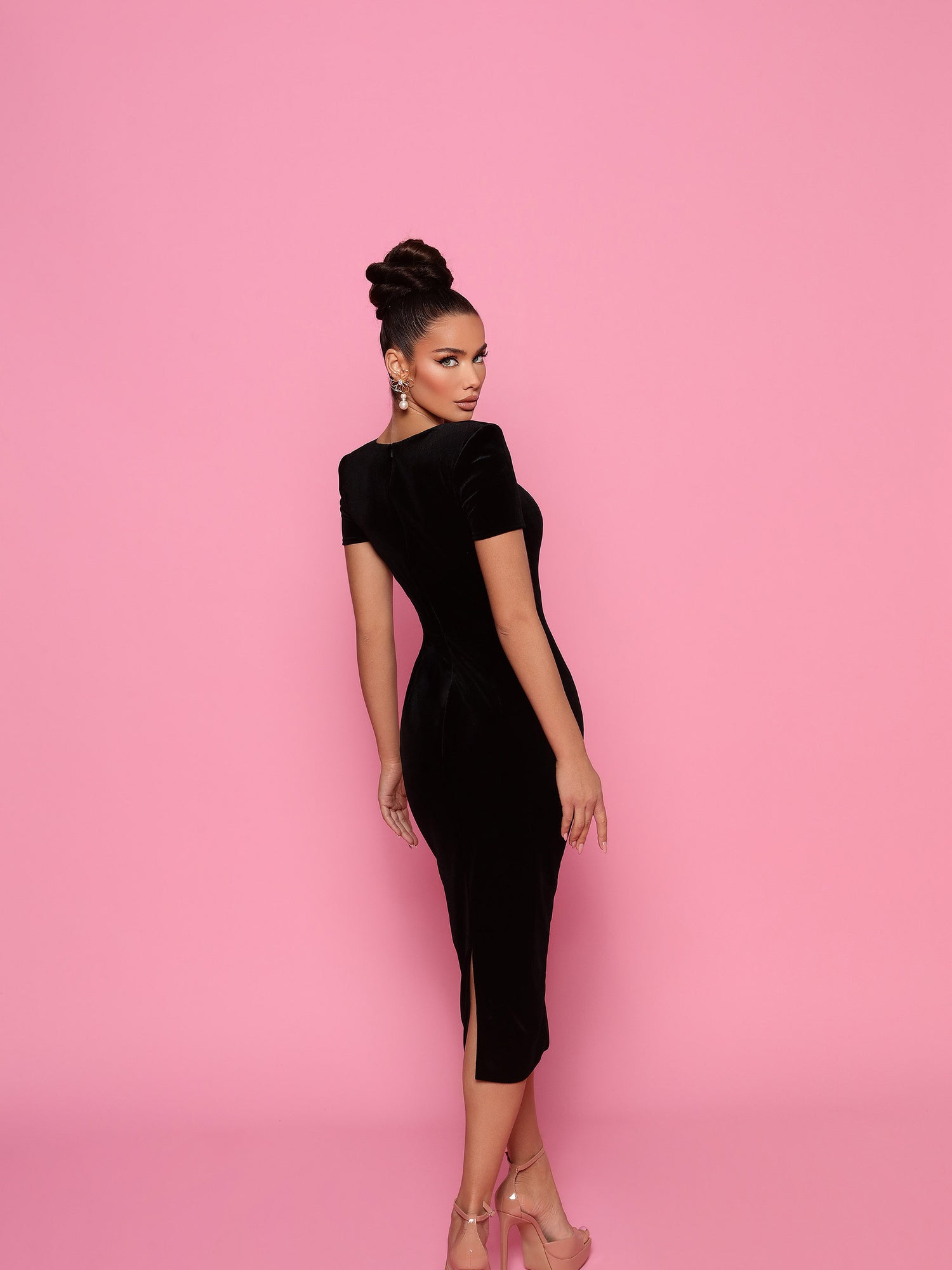 A gorgeous midi dress by Nicoletta NP160. A flattering style with a square neckline, short sleeves and accentuating shoulder pads.