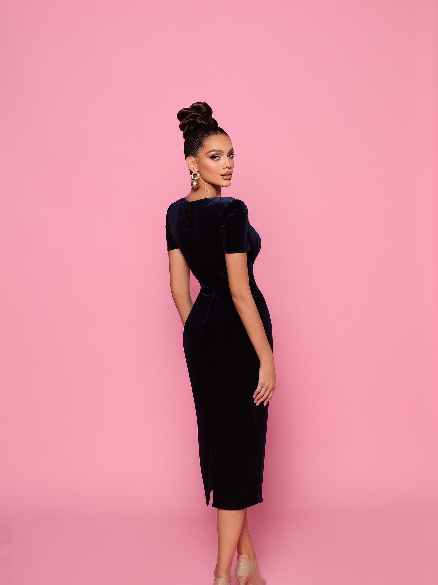 A gorgeous midi dress by Nicoletta NP160. A flattering style with a square neckline, short sleeves and accentuating shoulder pads.