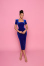 A gorgeous midi dress by Nicoletta NP160. A flattering style with a square neckline, short sleeves and accentuating shoulder pads.