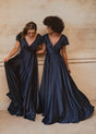 The Auckland bridesmaid dress features a V neckline and flutter sleeves. The Auckland features a gathered crossover bodice with v neckline, low v back, and flutter sleeves that sit delicately and comfortably on the arm. An elegant floor length skirt falls from the waistline, and over the hips to a slightly flared silhouette. This design is constructed from a luxurious charmeuse fabric that is soft on the skin, and comfortable enough for all day wear.