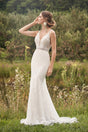 Look and feel your best in this allover lace wedding gown. The illusion bodice features a plunging neckline and illusion side cutouts. Multiple laces and trim create a sexy bohemian look. The scalloped train completes this style. This style is also available with the bodice lined to the side illusion inserts.