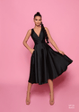A gorgeous midi length dress by Nicoletta NP150. A feminine style featuring a deep V neckline, a-line skirt and thick waistband.