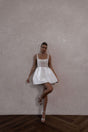Poppy perfectly encapsulates fun, youthfulness, opulence and modernity in the form of her sheer, pearlescent beaded, corset-like bodice and Mikado mini skirt lined to the zip with playful buttons. Designed with engagement parties, bachelorette nights and playful elopements in mind, Poppy is perfect party dress for our MWL Girls combining elements of some of our all-time favourite designs!