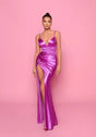 A gorgeous full length dress by Nicoletta NP166. An flattering style featuring ruching, thigh high split and spaghetti straps.
