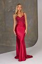 The dropped V front waistline adds a sophisticated touch, while the detachable flat lace beaded straps provide versatility in styling. The fitted mermaid skirt, featuring upper hip gathers, beautifully accentuates the figure.