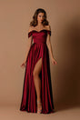 Embrace timeless elegance with this stunning gown, featuring an off-shoulder sweetheart neckline, a flattering cinched waist, and a flowing A-line skirt. Designed for both style and practicality, it includes a front leg split and hidden pockets for added ease.