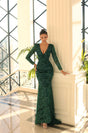 Step into timeless sophistication with the NC1006 by Nicoletta. This full-length gown features shimmering sequin embellishments, a flattering cross-over V-neckline, and sheer long sleeves for a graceful touch. The fitted bodice with mid-waist ruching flows into a mermaid-style skirt with a subtle back train, creating an elegant and unforgettable silhouette.