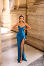 A gorgeous full length gown by Nicoletta NC1016. A strapless design featuring a detailed structured bodice, thigh high split and ruching on skirt.