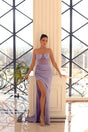 The NC1021 by Nicoletta is a show-stopping piece, crafted from shimmering lurex fabric for a dazzling effect. The strapless, sheer bustier features exposed crisscross boning, adding a hint of bold drama. With a high leg slit for a touch of elegance, this gown is the ideal choice for making a statement at any formal evening event.