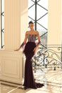 Sophisticated elegance in our NC1028 gown by Nicoletta. This stunning gown features an off-the-shoulder and straight neckline, a bodice adorned with stunning sequinned embellishments, a figure-hugging silhouette and mermaid style skirt with a small train. This gown is made from Soft Suiting and has no stretch.