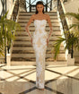 Turn heads in the Nicoletta NC1032! This strapless, fitted design features a striking sequin leaf pattern and a flattering straight neckline, complemented by a sultry back slit. To complete the look, detachable sheer ruched gloves are included, adding an extra touch of elegance and sophistication. Perfect for making a statement at any event, this gown is sure to make you the star of the evening.