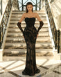 Radiate elegance on your special day in this stunning strapless mermaid gown by Nicoletta (NC1051). Designed with intricate beaded lace and a figure-enhancing corset bodice, this gown offers a sophisticated silhouette. Complete with sheer gloves for an added touch of refinement, this look brings modern romance to any formal occasion.