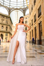 Make a lasting impression in the NC1077 by Nicoletta — a breathtaking choice for any elegant evening affair. Featuring a strapless straight neckline and a sheer bodice with exposed boning, this dress is designed to beautifully contour your figure. A soft tulle overlay adds refined ruffle detail to the top, while the sleek fitted skirt includes a graceful side split and draped side panel for added drama. A truly unforgettable and sophisticated piece.