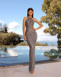 Turn heads in the captivating NC2015 by Australian designer Nicoletta. Designed to dazzle, this full sequin gown features a sophisticated high neckline, a striking low back framed by delicate shoulder straps, and a subtle back split for added allure. Perfect for formal events or glamorous evenings, this gown promises a show-stopping entrance every time.
