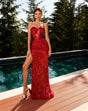Step into the spotlight with the Nicoletta NC2036—a breathtaking blend of glamour and elegance. This full-length gown features a strapless, sequin-adorned boned mesh corset that shimmers with intricate detailing. A sheer bodice adds a touch of seduction, while the daring thigh-high slit brings bold confidence to every step. Designed to captivate, this gown is perfect for unforgettable moments.