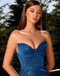 Add a touch of glamour to any event with the NC2045 by Nicoletta. This dazzling strapless dress is crafted from luxurious lurex fabric and features a striking high side slit with an overlay skirt, creating a bold and captivating look. Perfect for standing out at any occasion, this gown is sure to make a statement.