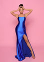 NP144 by Nicoletta features a fitted silhouette, side leg split, a straight neckline, and thin strap with a lace up back. Perfect for any formal occasion, this dress hugs the body in all the right places, while the lace up back provides you with the freedom to adjust the fit.