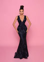 A stunning full length gown by Nicoletta NP152. A fitted gown featuring a deep v neckline and small train.